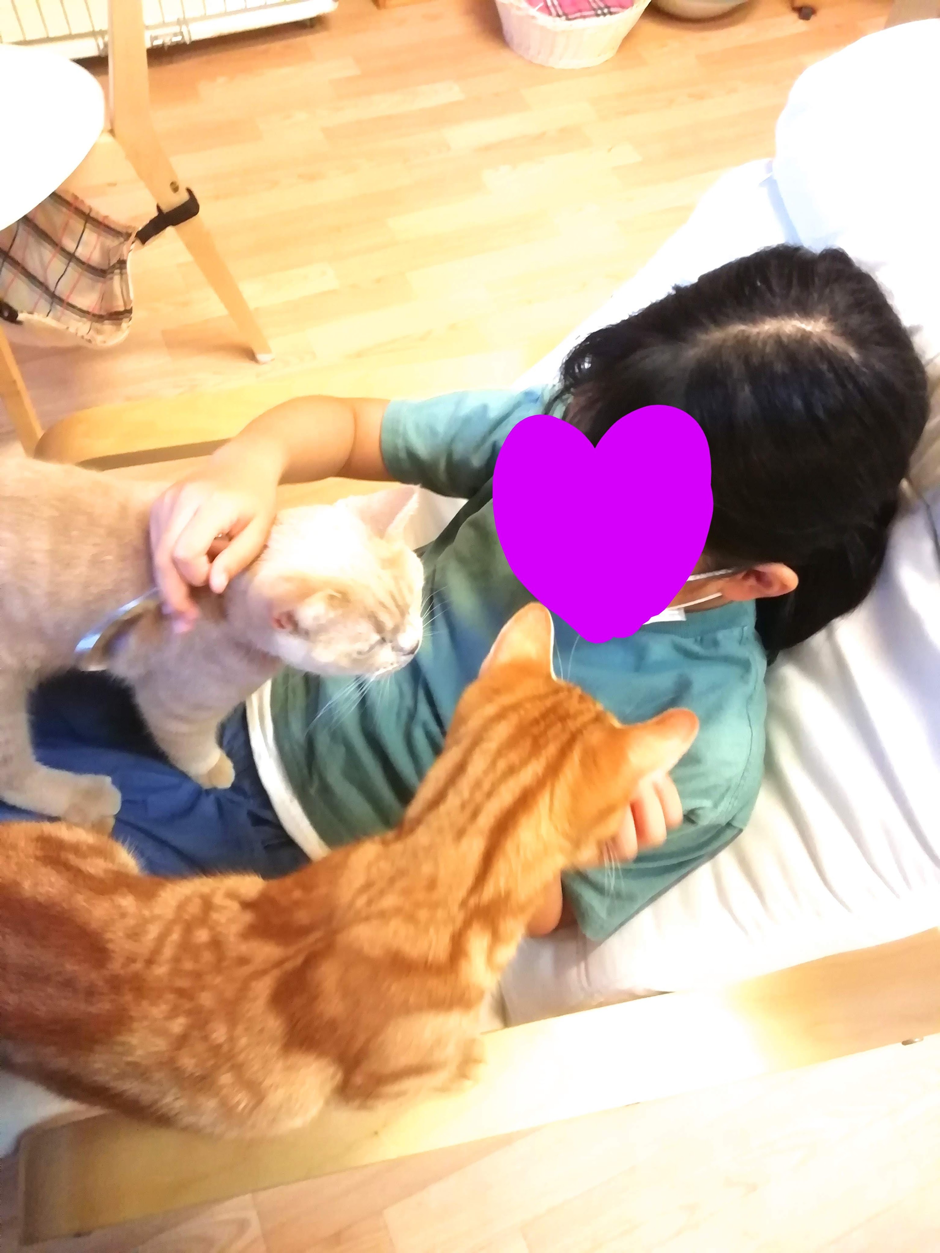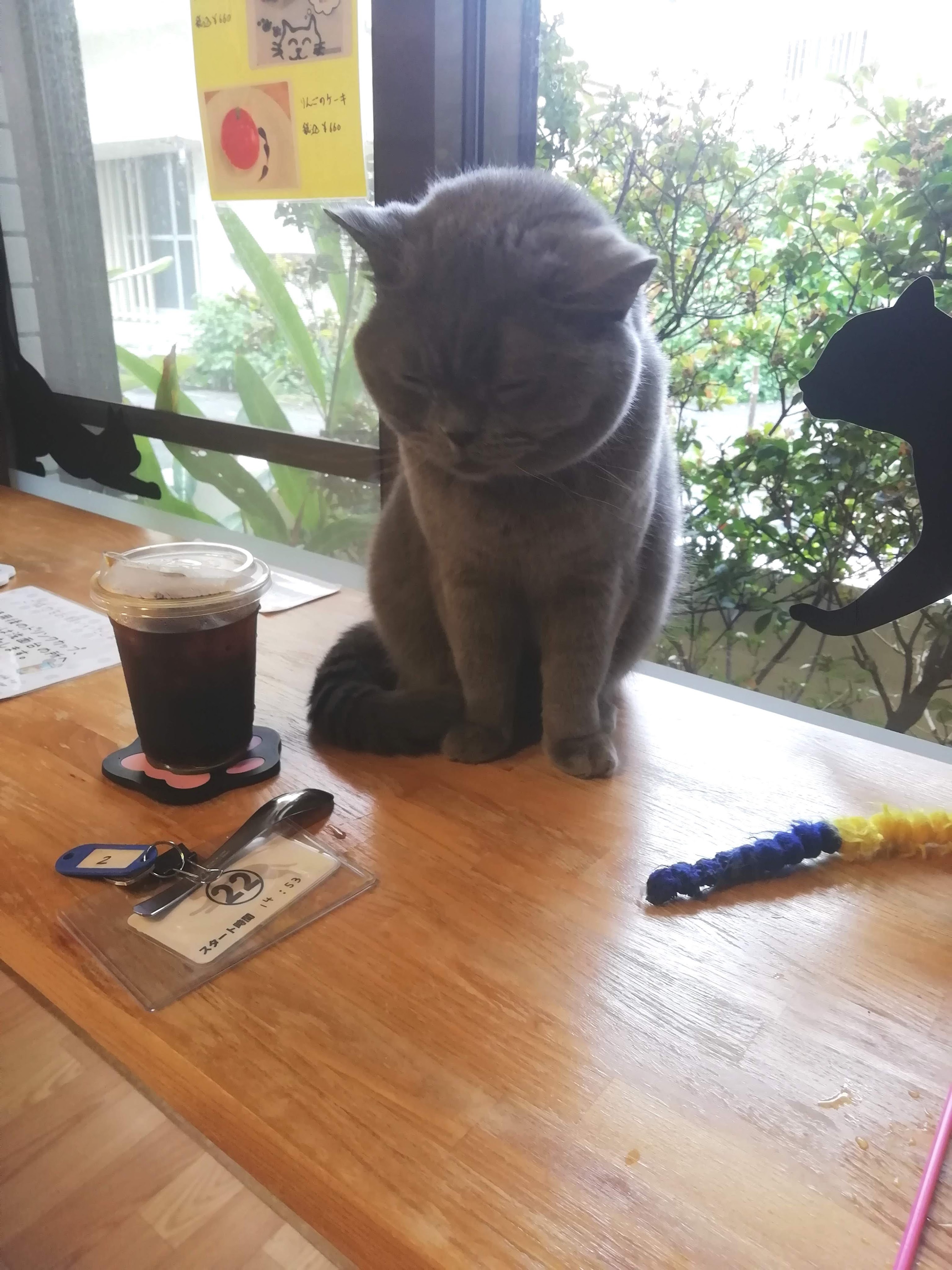 ただ、中には変わった子もいました。私は室内の椅子に座りアイスコーヒーを飲みつつ猫ちゃんと娘が戯れるのを眺めていたのですが、そんな私の前に1匹の猫ちゃんが来ました。何故かじっと座り、そっと目を閉じていました。ここまでじっとされると、なんだか置物にさえ見えてきました。しかも、撫でたら嫌がられ、餌を1粒あげてみましたがそれも無視され…。よくはわかりませんでしたが、ただ私の前に来て座って目を閉じたかったんだろう、と勝手に納得することにして、猫ちゃんとの2人きりの空間を静かに楽しみました。※個人的には犬派ですが。